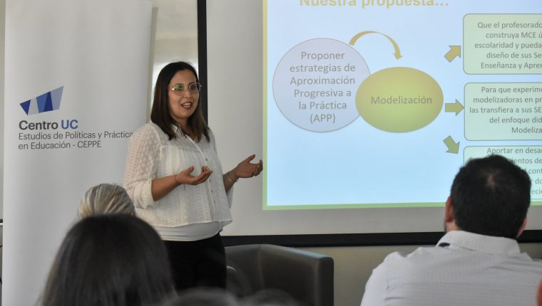 Durante su exposición, Macarena Soto presentó el trabajo desarrollado en el marco del proyecto FONDECYT 11220317 centrado en la modelización como práctica científica escolar fundamental.