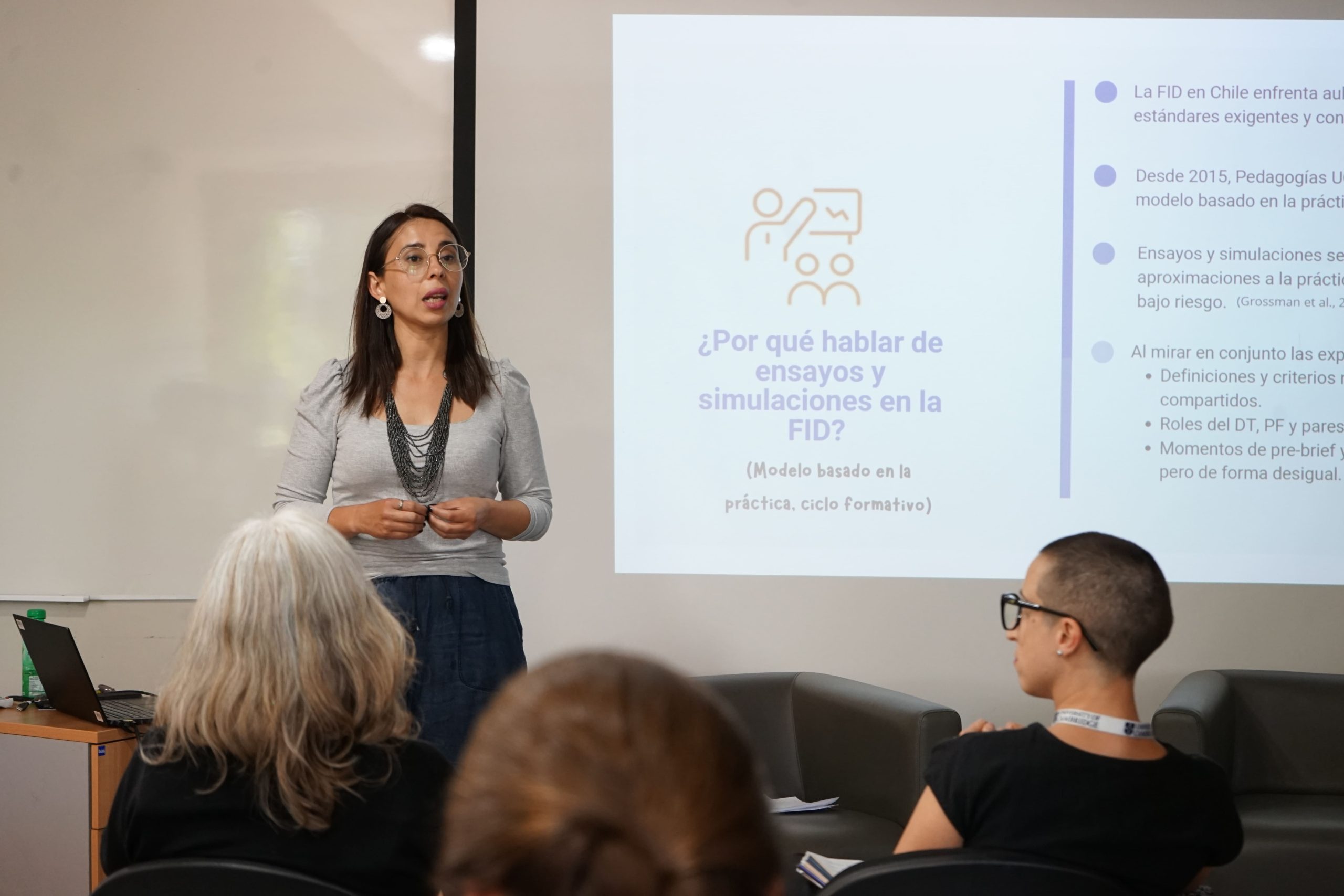 La Coordinadora de Prácticas de Pedagogía General Básica, Paulina Labra, presentó los avances de un proyecto FONDEDOC que busca unificar criterios, sistematizar prácticas y apoyar a los docentes tutores en el uso de ensayos y simulaciones en pedagogías UC.