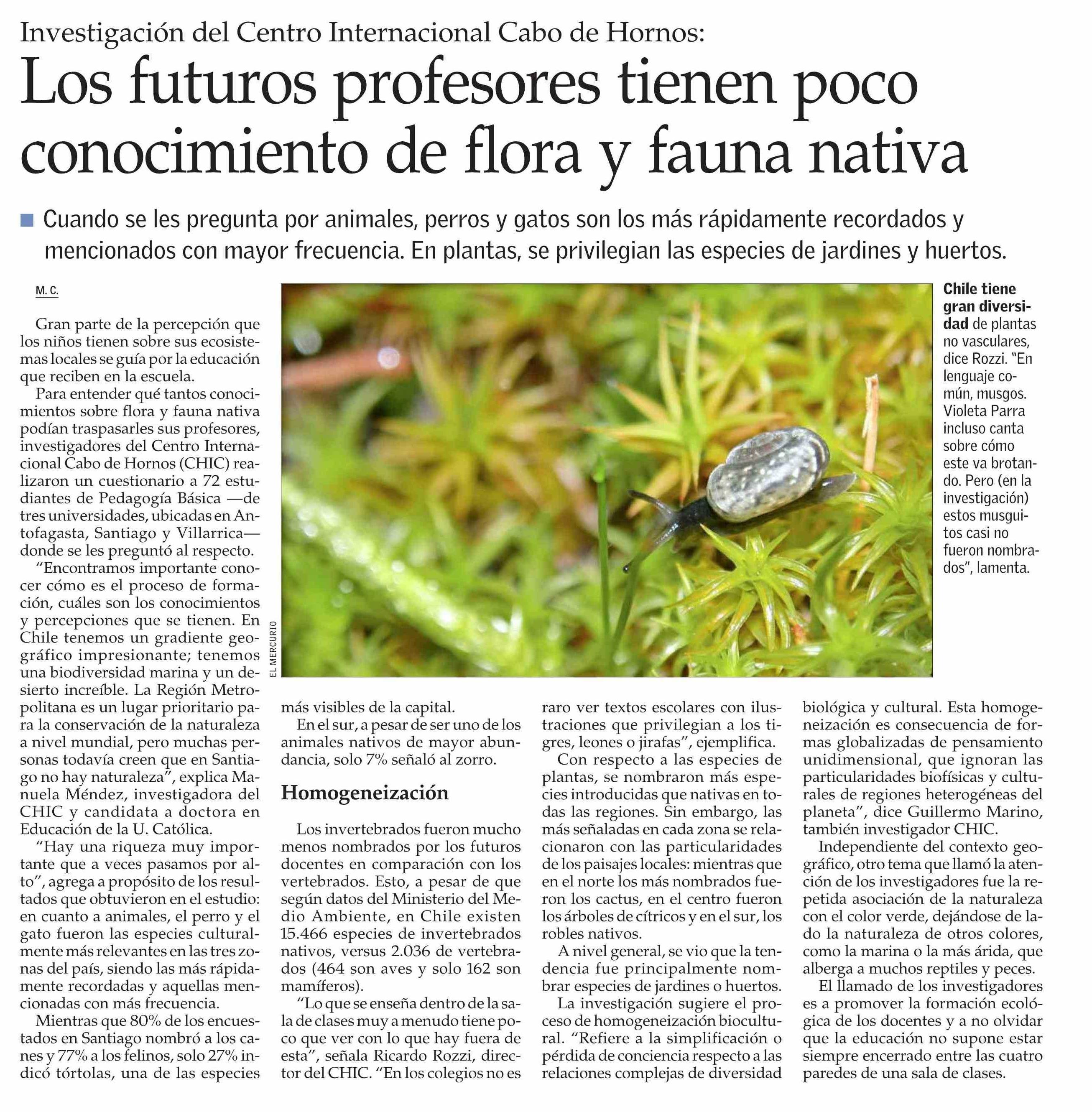 Con el fin de conocer qué tantos conocimientos sobre flora y fauna nativa podían traspasar los profesores chilenos a las y los alumnos, la estudiante del Doctorado en Educación UC Manuela Méndez implementó, junto a investigadores del Centro Internacional Cabo de Hornos, un cuestionario a 72 estudiantes de Pedagogía en Educación Básica de tres universidades, ubicadas en Antofagasta, Santiago y Villarrica. En el proyecto también participó el académico de la Facultad Guillermo Marini.