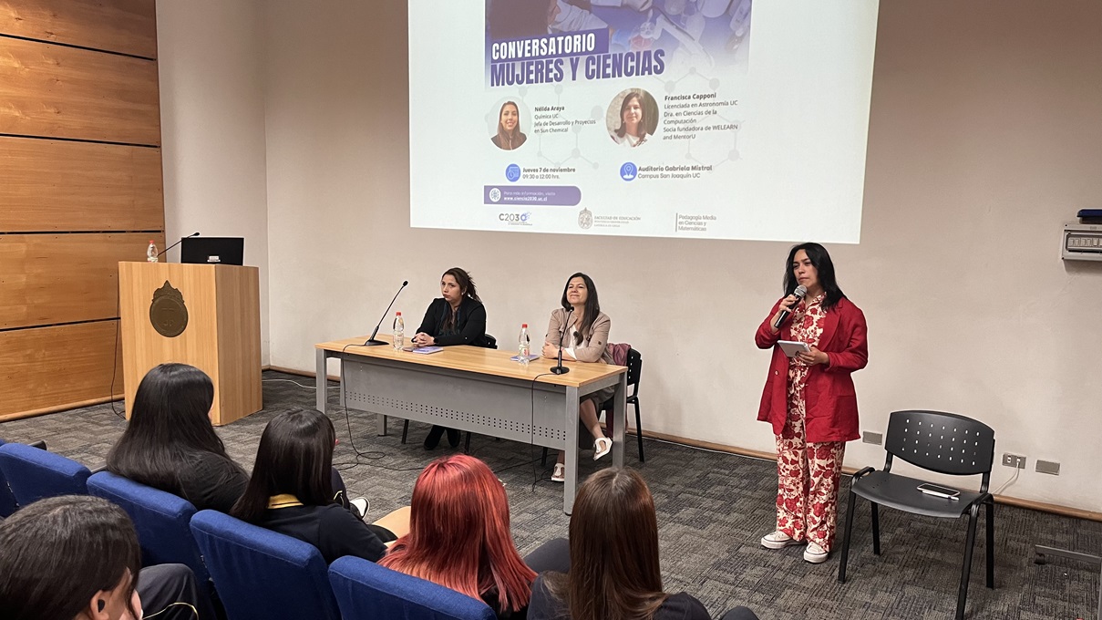 La conversación contó con la destacada participación de Nélida Araya, Química de la UC y jefa de Desarrollo y Proyectos en el área técnica de tintas base solvente de Sun Chemical Chile; y Francisca Capponi, licenciada en Astronomía de la UC, máster en Ingeniería, PhD en Ciencias de la Computación, y socia fundadora de MentorU y Welearn Innovatia. Durante el conversatorio, se generó un enriquecedor intercambio de ideas entre las expositoras y las estudiantes.