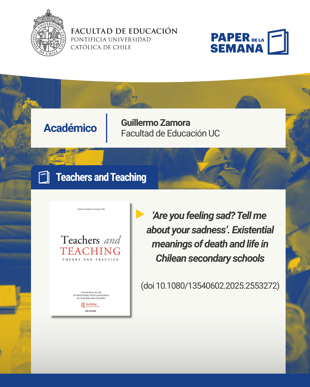 Esta semana, el paper destacado corresponde a “‘Are you feeling sad? Tell me about your sadness’. Existential meanings of death and life in Chilean secondary schools” del académico de Educación UC Guillermo Zamora (en conjunto con Maili Ow González, Catalina Lecaros Besa y Elisa Davanzo Barros).