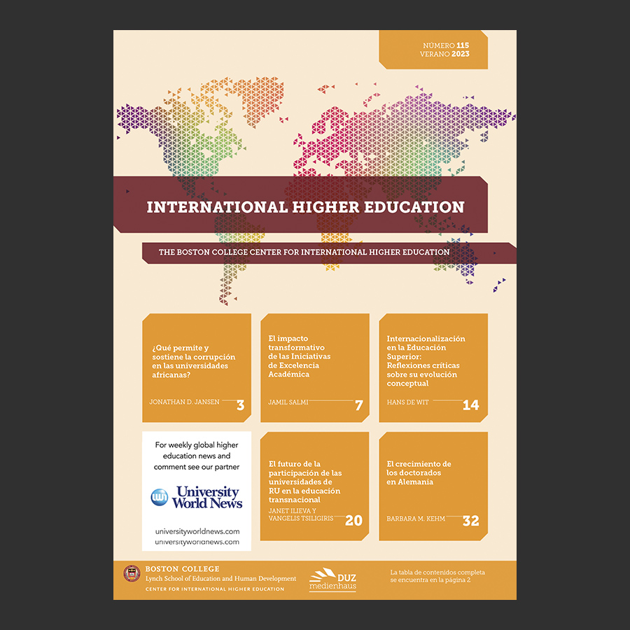La revista International Higher Education es una publicación trimestral del Centro para la Educación Superior Internacional de Boston College. En ella se publican artículos e informes que, desde una perspectiva global y comparada, buscan iluminar políticas y prácticas en Educación Superior. Como reflejo de la misión de la Facultad de Educación UC para incentivar la colaboración académica internacional y la difusión de conocimiento, editamos su versión en español, disponible para su descarga gratuita.